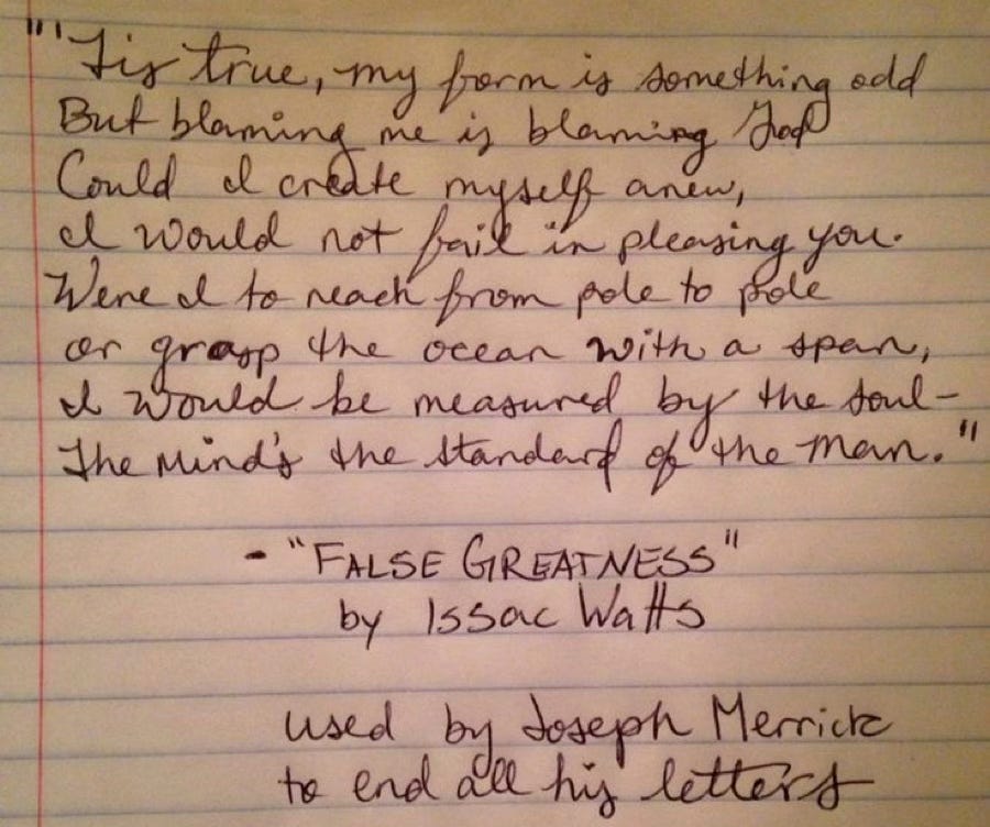 The text based image posted above is one that I came across on the web when I was looking up information about Issac Watts. As indicated within the image, the quote is one used by Joseph Merrick to end all his letters.