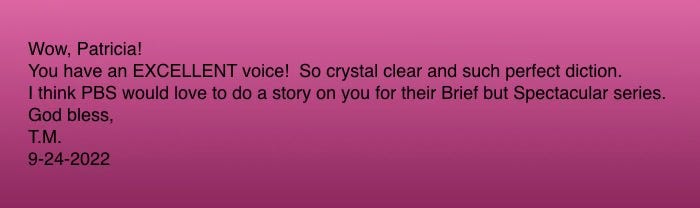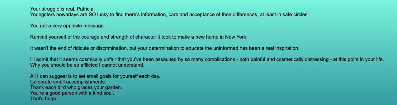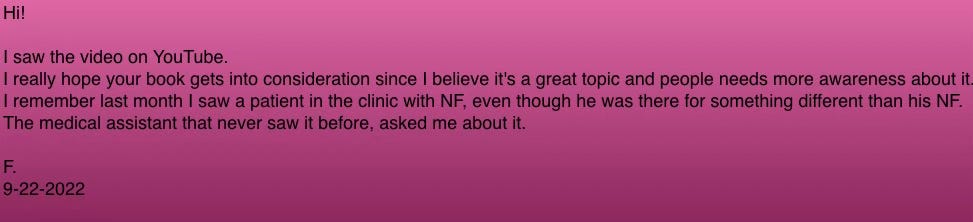 Unfortunately after that time, I had multiple surgeries that were necessitated by new NF symptoms and these prevented me from moving forward with my project, which I've mentioned within my previous Substack postings, so I won't belabor the point.
