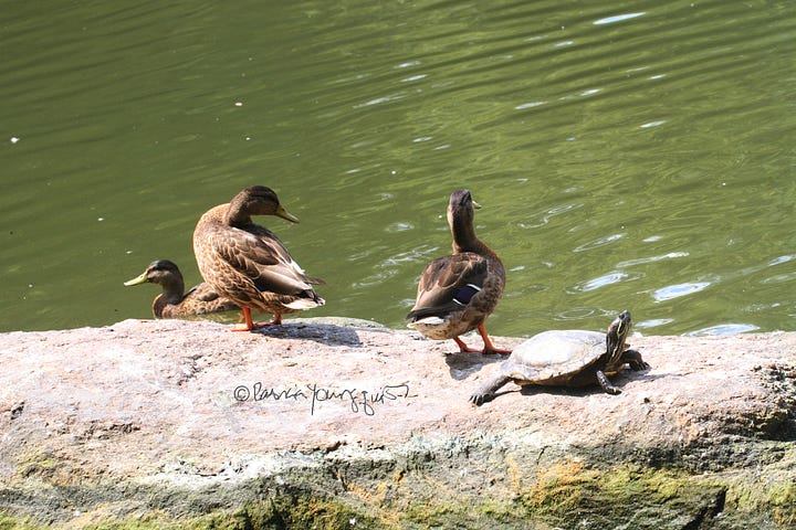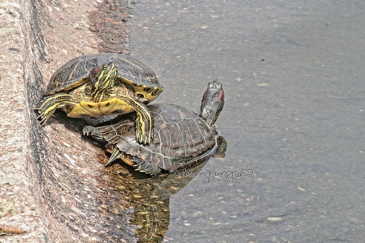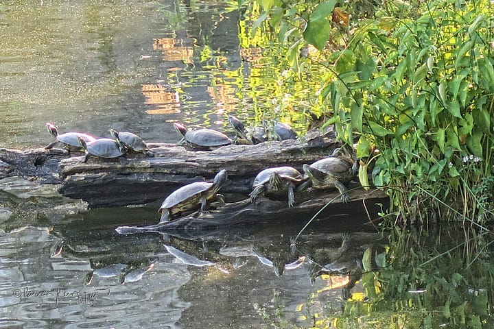This is what the turtles are doing today when I observe them spending time atop the rocks in Turtle Pond.