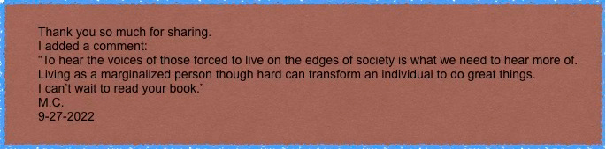 Her way of thinking and words remind me of what the minister from my small hometown in Illinois had told my parents when I was a child and with great clarity, I recall recording my thoughts about this in my diary.