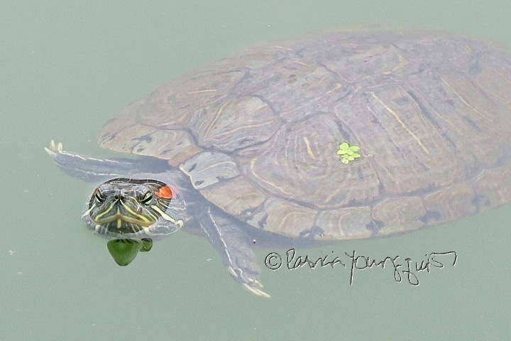 At this time I’m wearing a hat as well as sunglasses plus a face-mask, which means my facial features are nearly covered. I open my jacket a bit as it is getting unseasonably warm which the turtles have already noticed, many of them are catching the sun’s rays and they are not social distancing. Instead they are standing very close to one another or piling on top of each other. The reasoning is in the wild when turtles are basking they often are quite vulnerable to predators. A group of turtles, all stacked and huddled together, makes them appear to be bigger and stronger as a group.