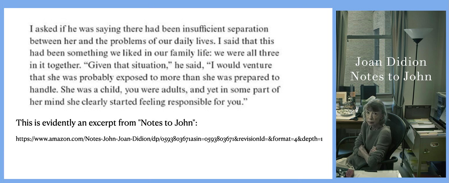 It is evidently from a note that Joan Didion intended for her husband (John) and in it she is recalling some aspects from one of her recent sessions with her physiatrist, when she asked him if he was "saying there had been insufficient separation" between her daughter and her and her husband's lives. She evidently went on to say, "This [the sharing of family problems] had been something we liked in our family life" and that she, her husband and her daughter, "were in it together."